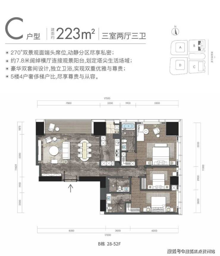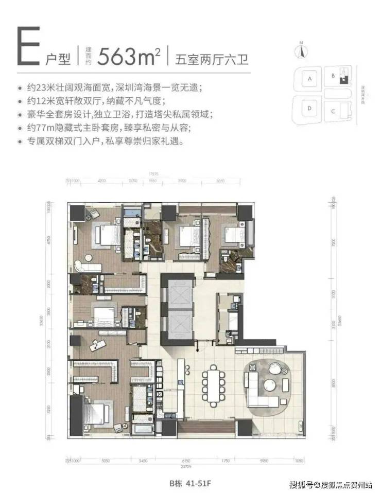 观景阳台:高区340平米户型,东面23米宽无敌海景视野(塔楼总观景面约46米)