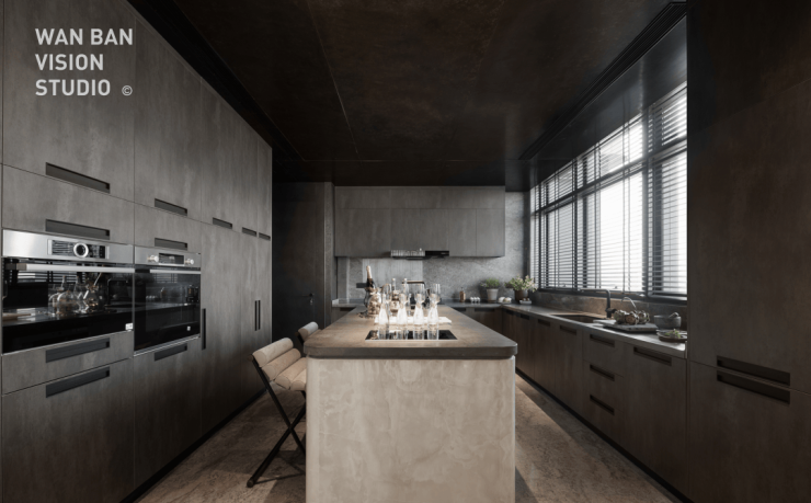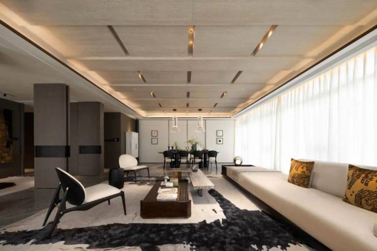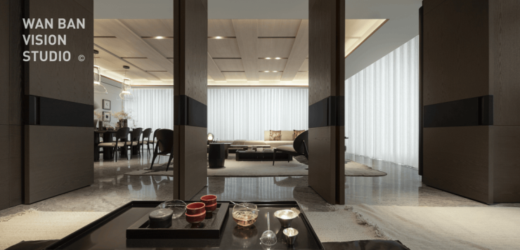 大量的深色系木材运用,搭配大面积的大理石,透露着一种古朴又时尚的质感,这是吴滨想要的「摩登东方」意境。入门第一眼你会注意到一个背景墙充满禅意的茶室,它可以是独处的空间,而把屏风一样的木质移门打开,它又成为了餐客厅一体化公区的组成部分。