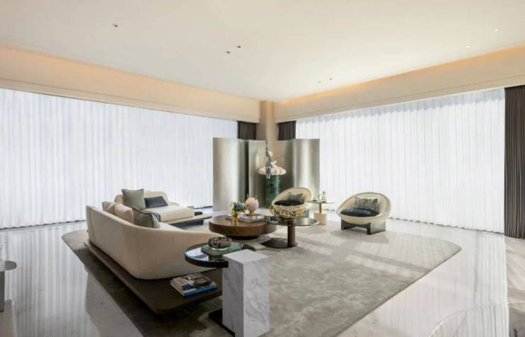 绿洲」设计灵感源起于“西湖佳茗”,自玄关进入即可看到一片悬浮的绿洲,自然生出了“开门即是绿意”的游园情境。约3.8米的层高,将舒适维度立体舒展,各个公区空间的串连,形成大而开放的广阔场域,成就世界归客的精神领地。