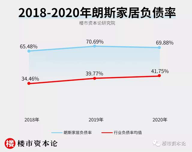 招股书显示,2018-2020年,朗斯家居负债率分别为65.48%、70.69%和69.88%,远高于行业平均水平。