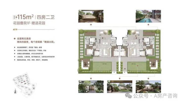 首层约115m²四房两卫户型,送双花园