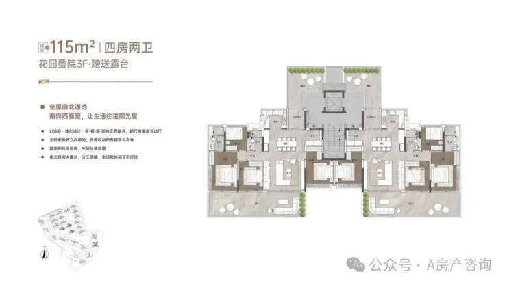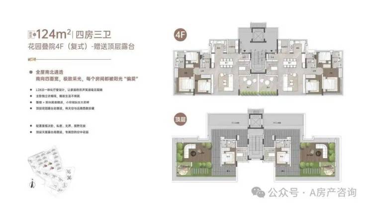 这是最接近墅级形态的户型,下层做了侧花园设计,顶层的天面露台全赠送,实现了约242%的使用率。