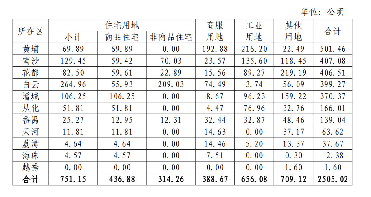 其中,增城区商品住宅用地计划供应106.25公顷,在11个区里供应最多;其次是黄埔区,计划供应商品住宅用地69.89公顷;南沙和花都则分别计划供应商品住宅用地59.42公顷和59.61公顷。