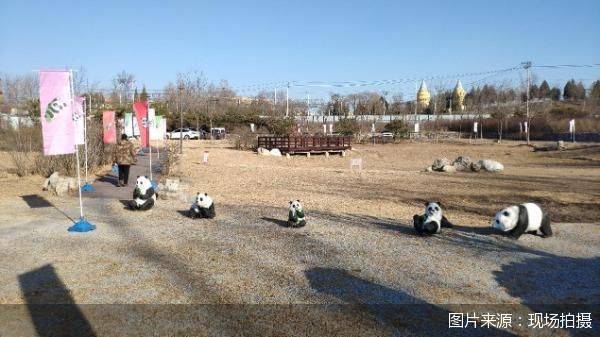 北京商报记者实地探访看到,在北京大熊猫公园建设筹备指挥部的场地内摆设有几只形态各异的熊猫雕塑,并且在道路两侧还插着数十面道旗,旗子上面印有熊猫图案。