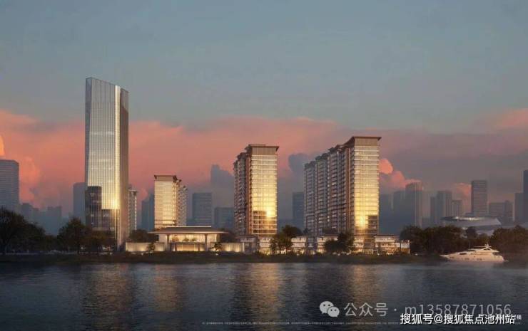建筑立面以观澜屏玻璃立面辉映江水波澜与天际浩瀚,香槟金格栅是鎏金显贵,黄金缕线条流畅灵动,新中式韵律之美点缀CBD天际线