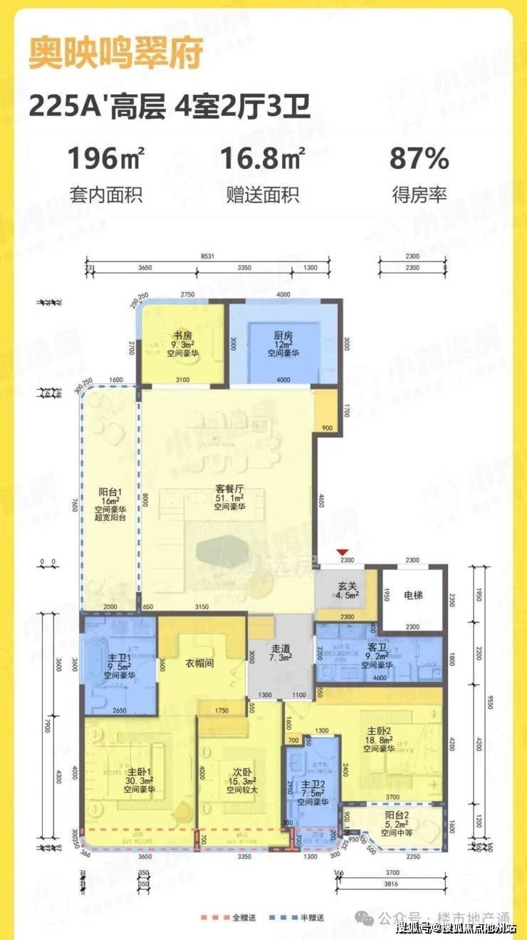 1)225方西边套:4房2厅3卫,得房率87%