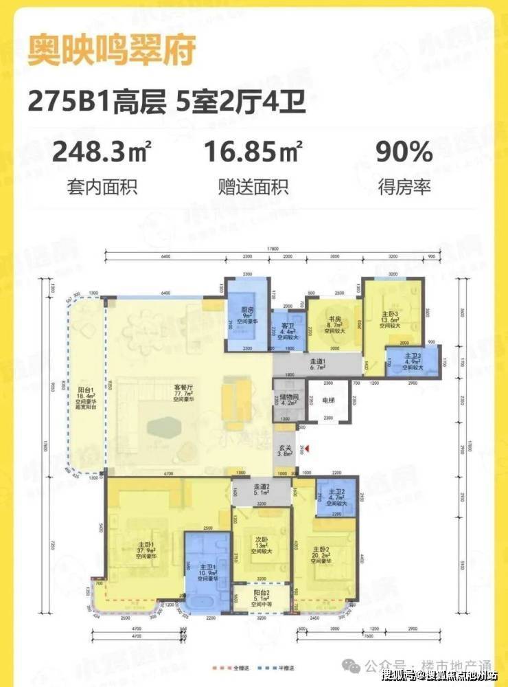 2)275方边套:5房2厅4卫,得房率90%