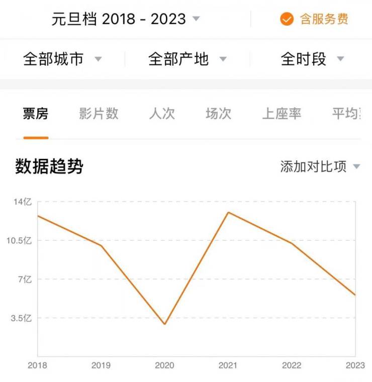 据灯塔数据,2023年元旦档(12月31日-1月2日),全国电影票房收入5.54亿元,同比大降45.8%,这是自2018年以来同档期票房最差成绩(排除受疫情影响最严峻的2020年)。在2021年元旦档,票房达到13.03亿元。