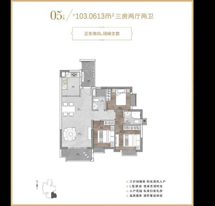 最大的在售户型是 103㎡的 3 室 2 厅,总价在 336 万到 450 万元之间,不同楼层和朝向价格差异较大,这个户型的客厅面宽更宽,阳台也更大,部分房源能看到远处的街景,适合有老人同住的家庭。