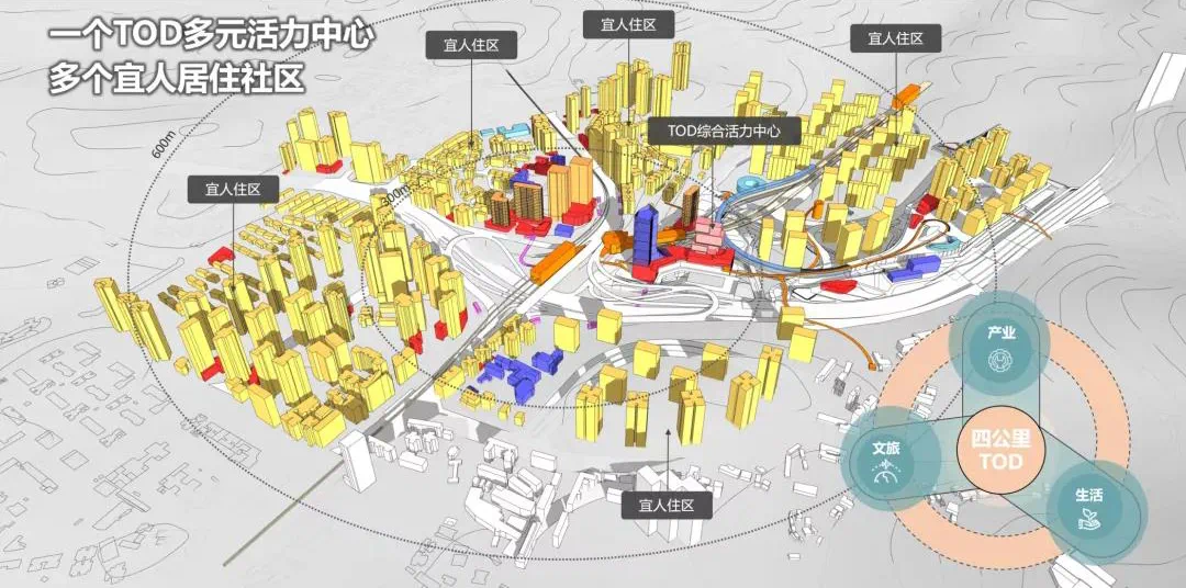 即以重庆轨道交通站点为中心,按10分钟舒适步行可达距离,以轨道交通项目本体以及站场周边站点600米半径为基础构建集约紧凑、功能复合的综合开发区,打造集工作、商业、文化、购物、娱乐、出行、居住等于一体的混合功能区。