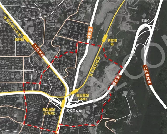 根据公示方案,四公里站TOD位于重庆南岸区核心位置,西邻四公里交通枢纽站,东靠南山风景区,紧邻地铁环线车站,和单轨3号线车站。