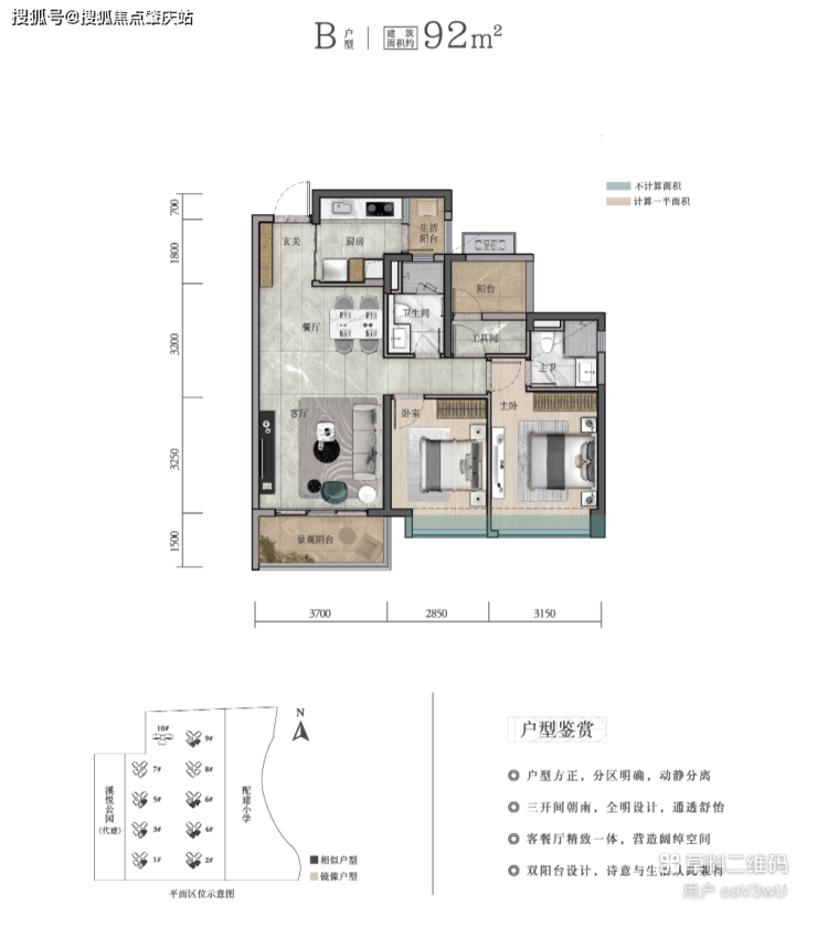 【户户朝南 无遮挡】全区户户朝南无遮挡设计,楼栋黄金比例45°角错开排布,三开间及四开间朝南,极致采光;
