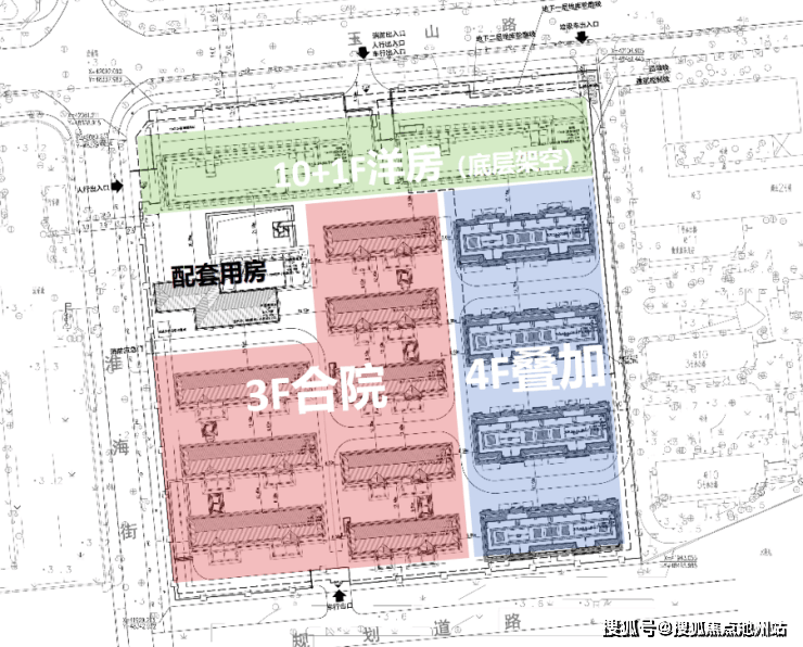容积率1.3,拟建8栋3F合院、4栋4F叠加以及2栋10+1F洋房(洋房底层架空),配建一个下沉式庭院会所,主出入口在玉山路,淮海街上设有一人行出入口,南侧规划道路还有一车行出口。