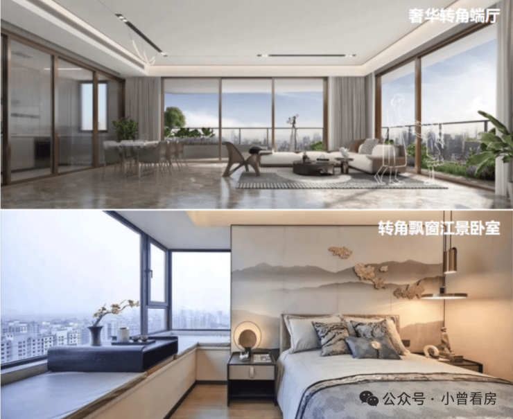 为了更大限度瞰江,飘窗采用270°转角设计,这在豪宅中才比较常见。
