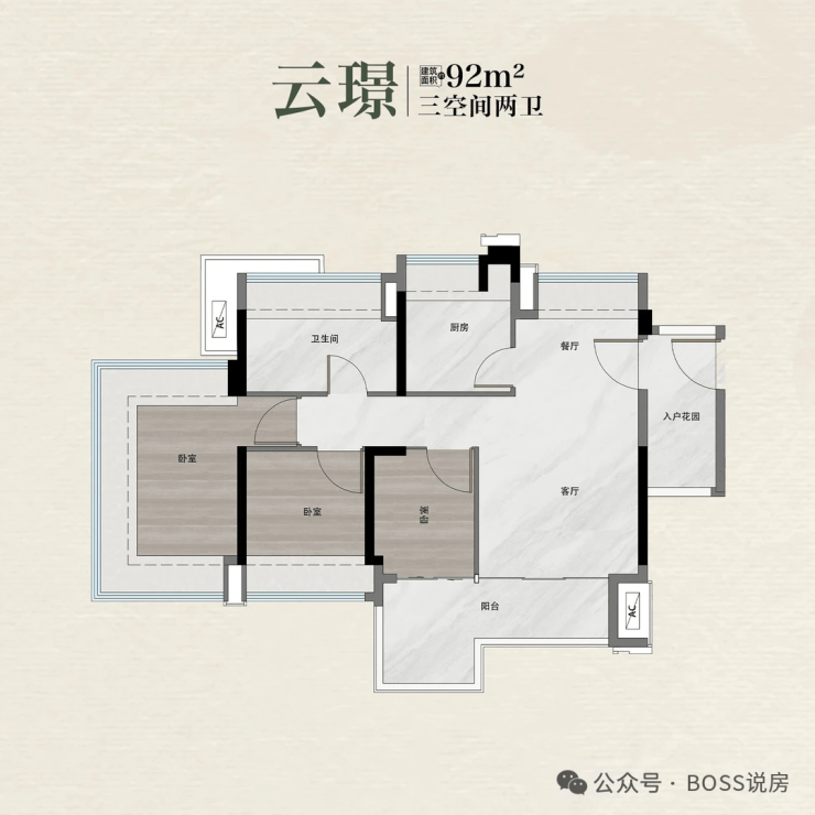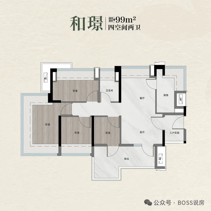 产品亮点:新规高使用率(据称超 100%),全屋飘窗,搭配入户花园与大面积阳台,空间通透。