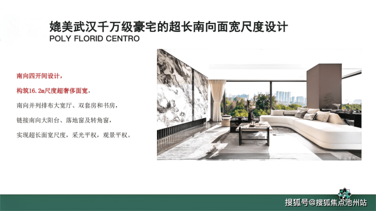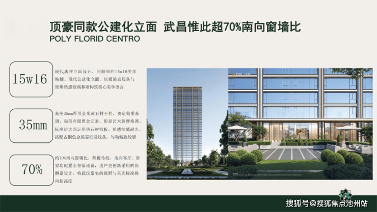项目采用大面积玻璃幕墙、金属铝板以及真石漆打造极具昭示性的外立面。其南向窗墙比达到约70%,客厅卧室全景落地,可以说是突破极限,将武汉高端住宅的视野采光标准推向了新高度。