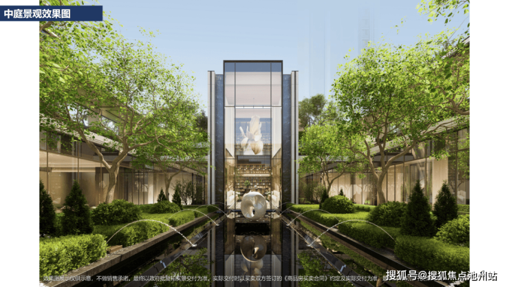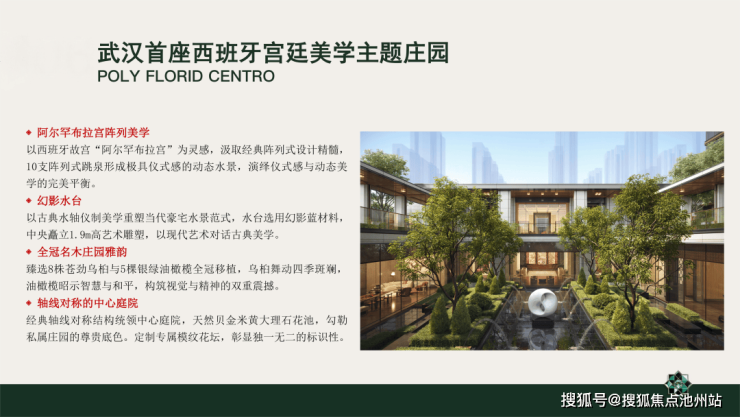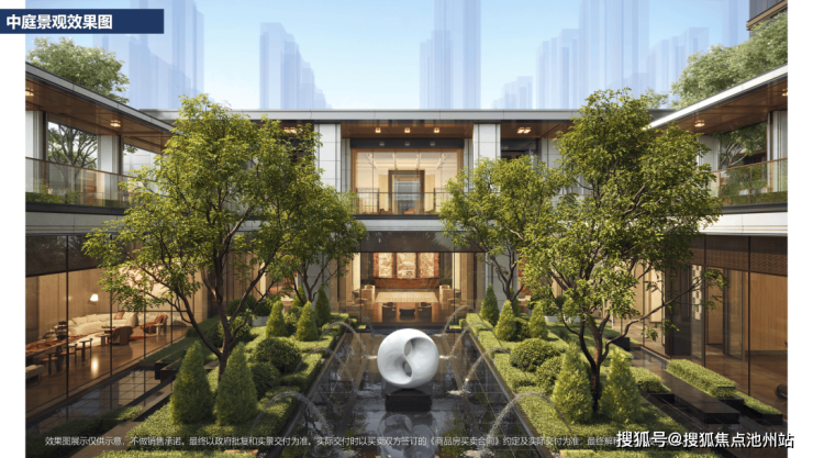 项目以西班牙故宫‘阿尔罕布拉宫’为灵感,呈现极具仪式感的阵列式跳泉,幻影水台,水台中央矗立约1.9m高艺术雕塑。中心庭院打造天然贝金米黄大理石花池,更不惜成本全冠移植8株苍劲乌桕。