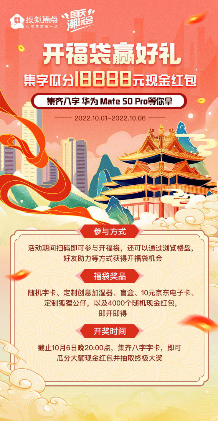 每个福袋都能开出惊喜好礼,同时,集齐“国、庆、有、礼、聚、在、焦、点”八个字的卡片后,在10月6日20:00即可瓜分18888元现金红包,并且拥有抽取大奖“华为Mate 50 Pro”的机会哦!
