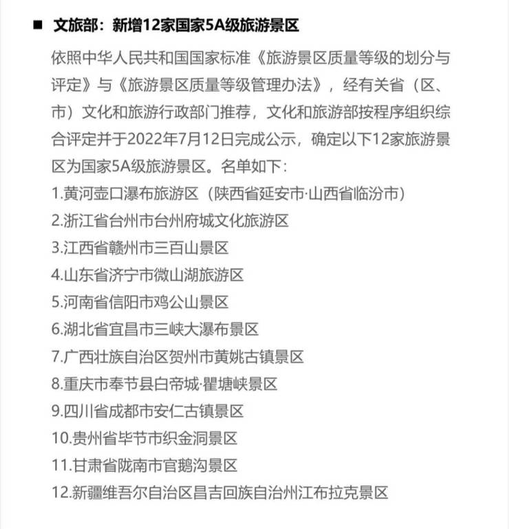 本周,依照中华人民共和国国家标准《旅游景区质量等级的划分与评定》与《旅游景区质量等级管理办法》,经有关省(区、市)文化和旅游行政部门推荐,文化和旅游部按程序组织综合评定并于2022年7月12日完成公示,确定以下12家旅游景区为国家5A级旅游景区。