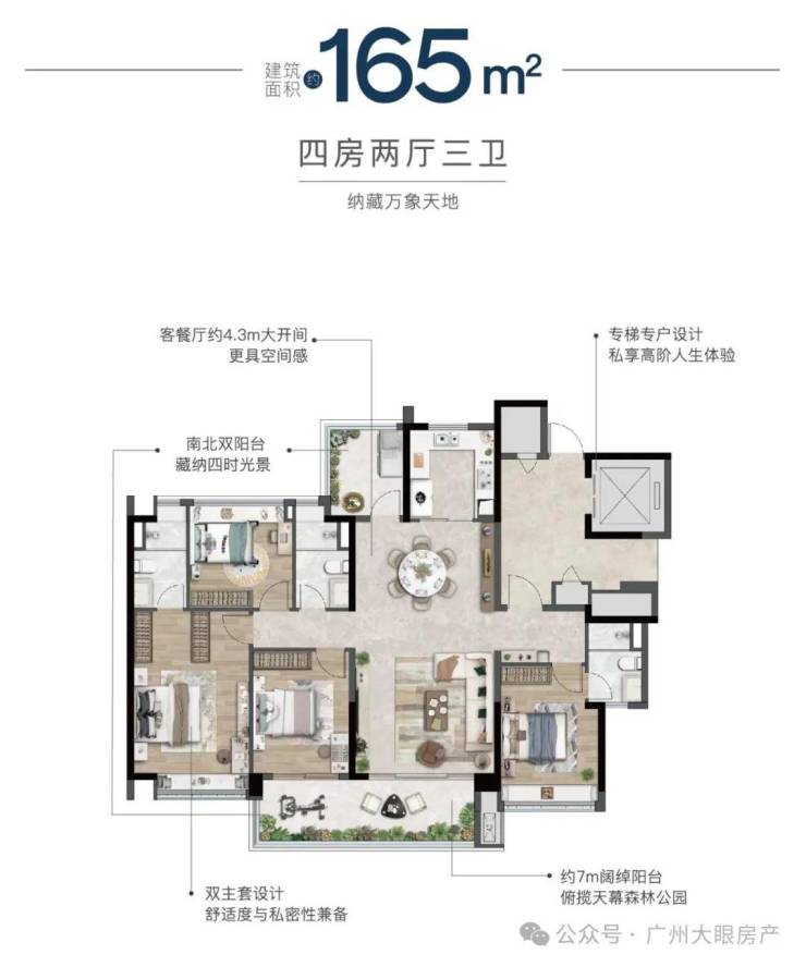 主推建面约104-168㎡全四房户型,两梯两户或两梯三户设计