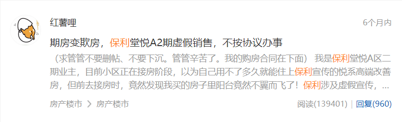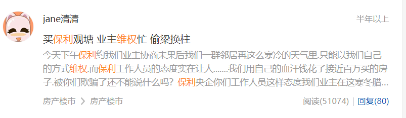 据不完全统计,2020年保利旗下观塘、堂悦、中央云璟、林语溪、金香槟、保利山庄梧桐等6个楼盘都发生了不同程度的维权事件。
