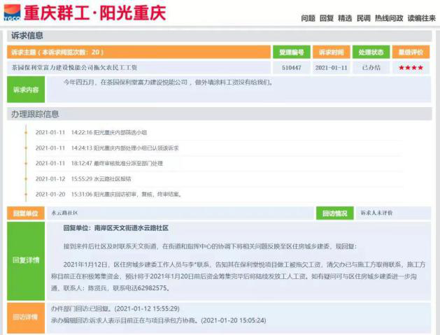 据报道称:“有农民工反映,去年4、5月份,在重庆茶园保利堂悦楼盘做外墙涂料工作,工资都还没有支付,一直拖欠”。