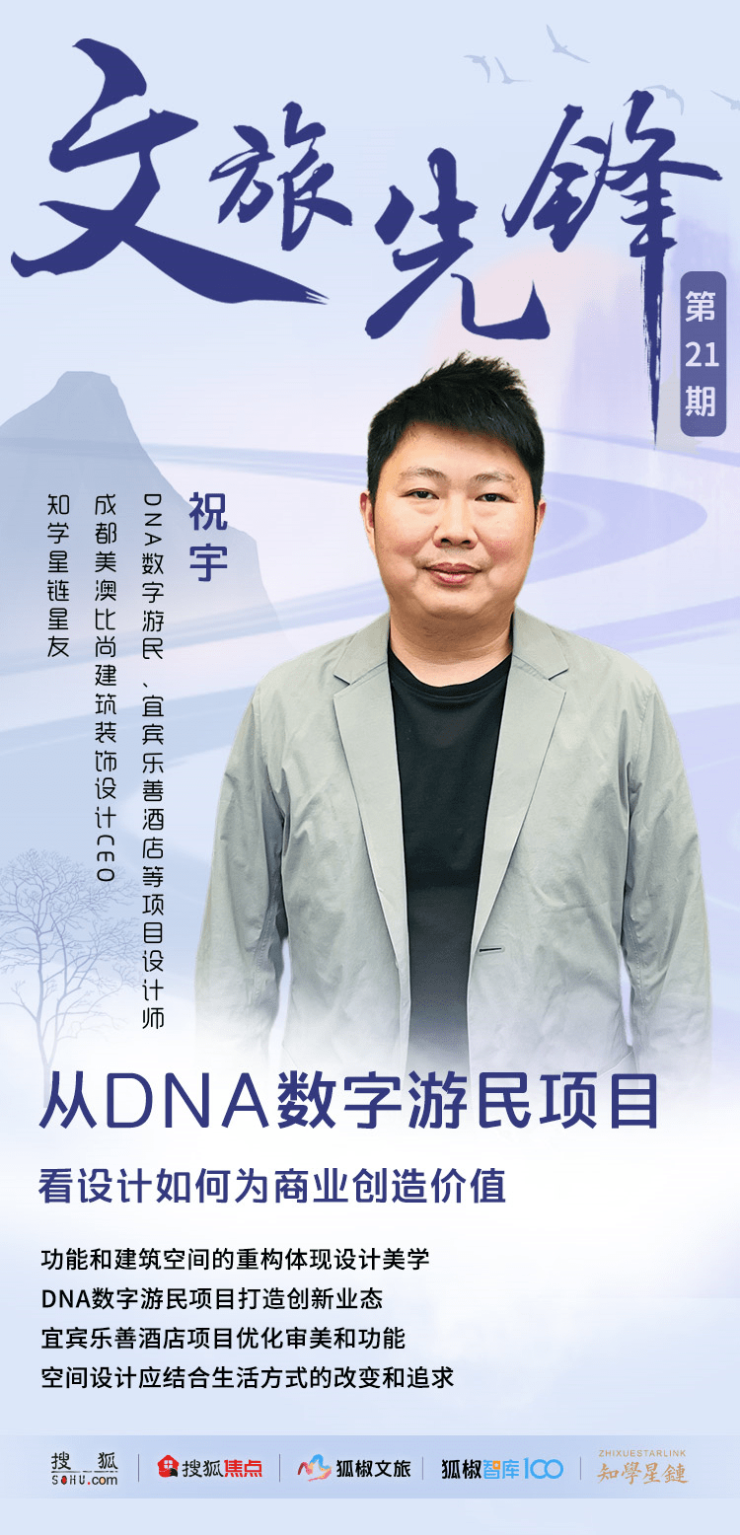 这两处地方看似没有关联,却都是通过对项目整体的设计规划、建筑景观设计、以及室内综合设计,打造出的盈利情况极好的商业地产项目。为进一步了解DNA数字游民项目和宜宾乐善酒店项目的打造,探究如何将商业与设计结合,通过设计为项目创造价值,狐椒文旅对这两个项目的设计师、成都美澳比尚建筑装饰设计CEO、知学星链星友祝宇先生进行了专访。