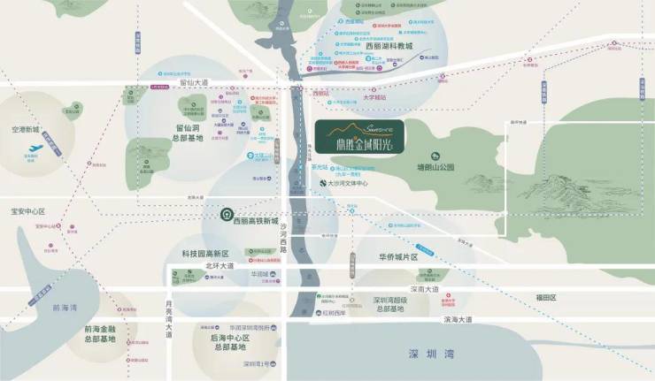交通方面,7号线茶光、5号线大学城(直线距离约700米)、5号线西丽(直线距离约800米);距西丽高铁站2.1公里,距深圳北站8公里;沙河西路、留仙大道、南坪快速、北环大道。