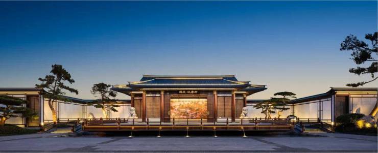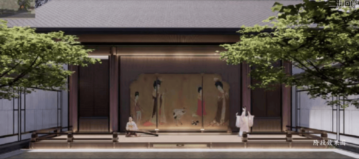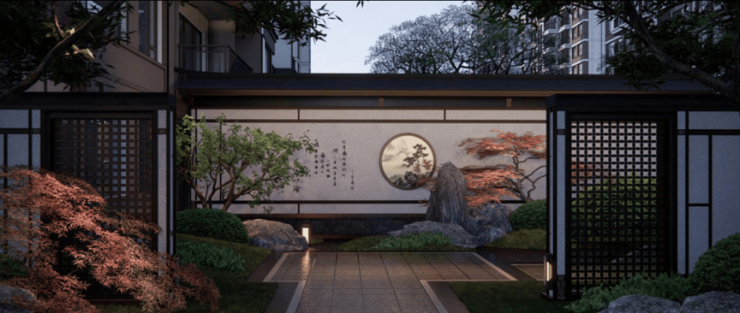 项目采用三段式入户:一进辋川入画(主入口空间),二进:闲庭碎影(戏台庭院),三进:临风听湖(自然庭院)。入户大门屋顶采用唐代“重檐歇山顶”形式配上台基上的唐代建筑标志阑干,入院后有一副唐风画作,其次以亭台楼榭、理水叠山的中国园林意境,重现盛唐大明宫百花争艳,小桥流水,落叶如金的景观。社区景观层层递进,让住户置身其中,体验唐风山水。
