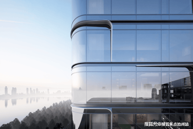 立面为全玻璃幕墙,辅以灰色层间铝板线条及香槟色浪花造型,写意江面星星点点的波光效果,打造立面层次感,增加精致度,同时结合近3米长转角圆弧的宽幅玻璃幕墙,形成室内外无界场景,揽江入室。