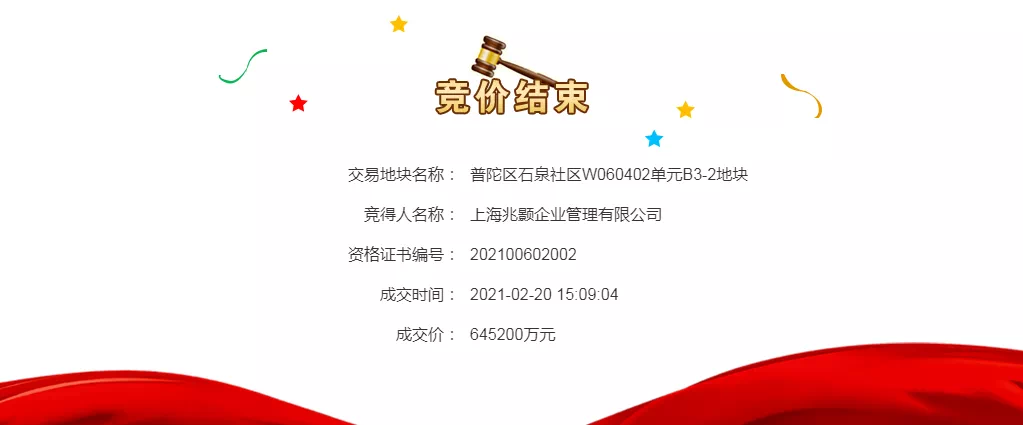2021年2月20日,融创&建发联合体以楼板价约8.43万/平,溢价率36.15%,总价约64.52亿竞得普陀区石泉社区W060402单元B3-2地块!