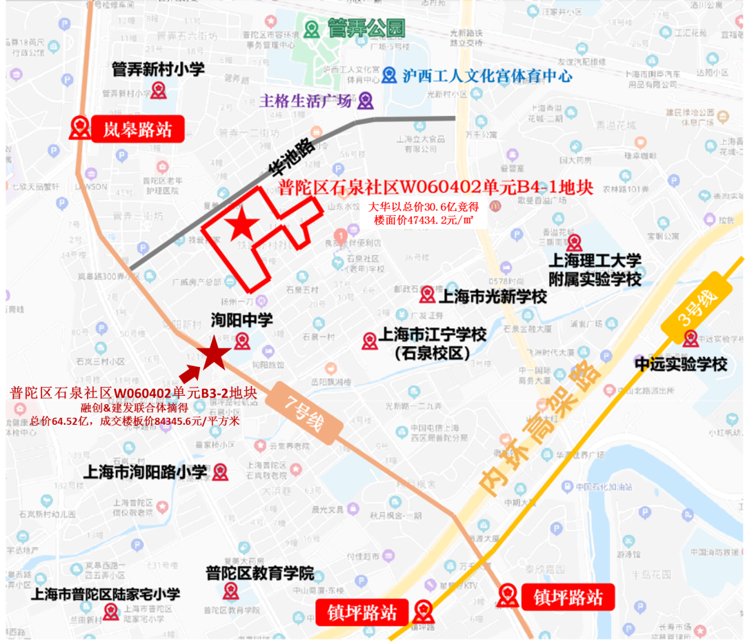 2020年12月,上海长华置业发展有限公司(大华)以总价30.6亿元,楼板价约4.74万/㎡的价格竞得普陀区石泉社区W060402单元B4-1商住地块,与融创&建发地块仅一路之隔,楼板价却低了很多!
