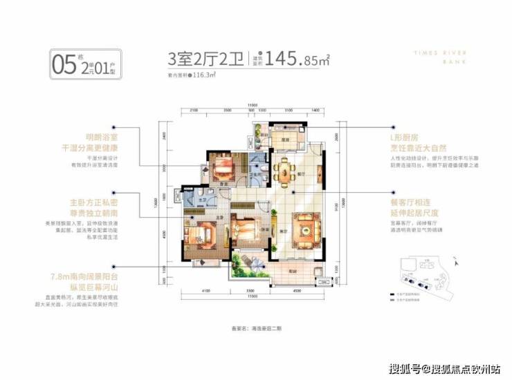 其中约145㎡户型,约7.8米南向阔景阳台,直面黄杨河美景,巨幕山河尽收眼;主卧朝南,美景随飘窗入室,延伸极致浪漫。