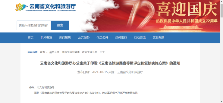 10月15日,云南省文化和旅游厅办公室印发关于《云南省旅游民宿等级评定和复核实施方案》的通知。通知称,旅游民宿等级评定依据《旅游民宿基本要求与评价》及第1号修改单进行。“必备项目检查表”分别规定了丙级、乙级、甲级旅游民宿的必备项目。“一般要求评分表”规定了各级民宿得分标准,该表共200分,由环境和建筑(30分)、设施和设备(60分)、服务和接待(60分)、特色和其他(50分)四大项组成。丙级四大项总分较低得分率40%,乙级、甲级规定各大项较低得分率:乙级60%、甲级80%。