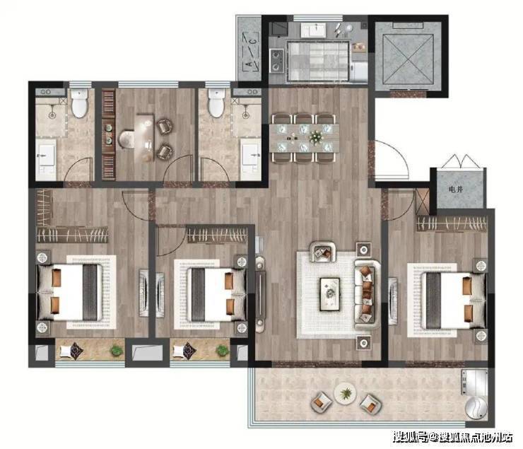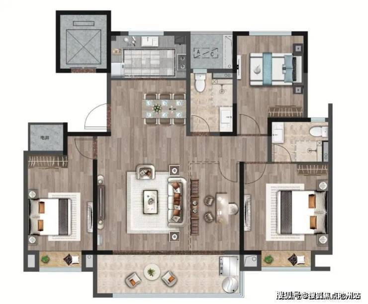 整套户型做到了四房两厅两卫结构,满足了深度改善客群全家人的居住需求。