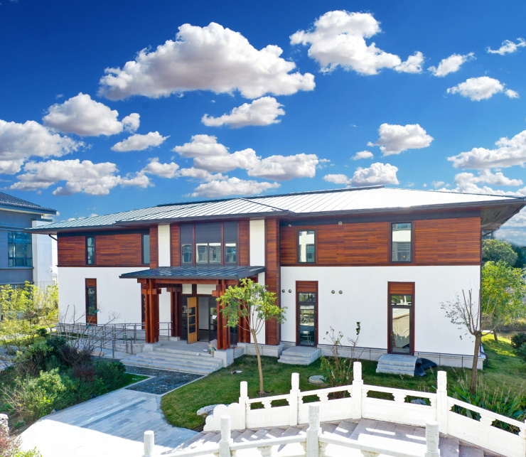 江苏城乡建设职业学院接待来访学校宾客的酒店,总面积592平方米,共两层,含8套客房。建筑主体结构为两层轻型木结构,仅在大厅和入口处采用了胶合木结构框架。项目在设计阶段考虑到为可再生能源的利用尽可能多的预留安装位置,在满足现阶段可再生能源利用率10%的较低要求前提下,为未来达到零能耗建筑做准备。