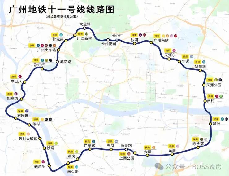11号线是广州首条市区大环线,串联广州中心五区,与广州现有及未来的所有地铁实现换乘,被称为“换乘之王”(已经开通)虹吸全广州的优质资源;