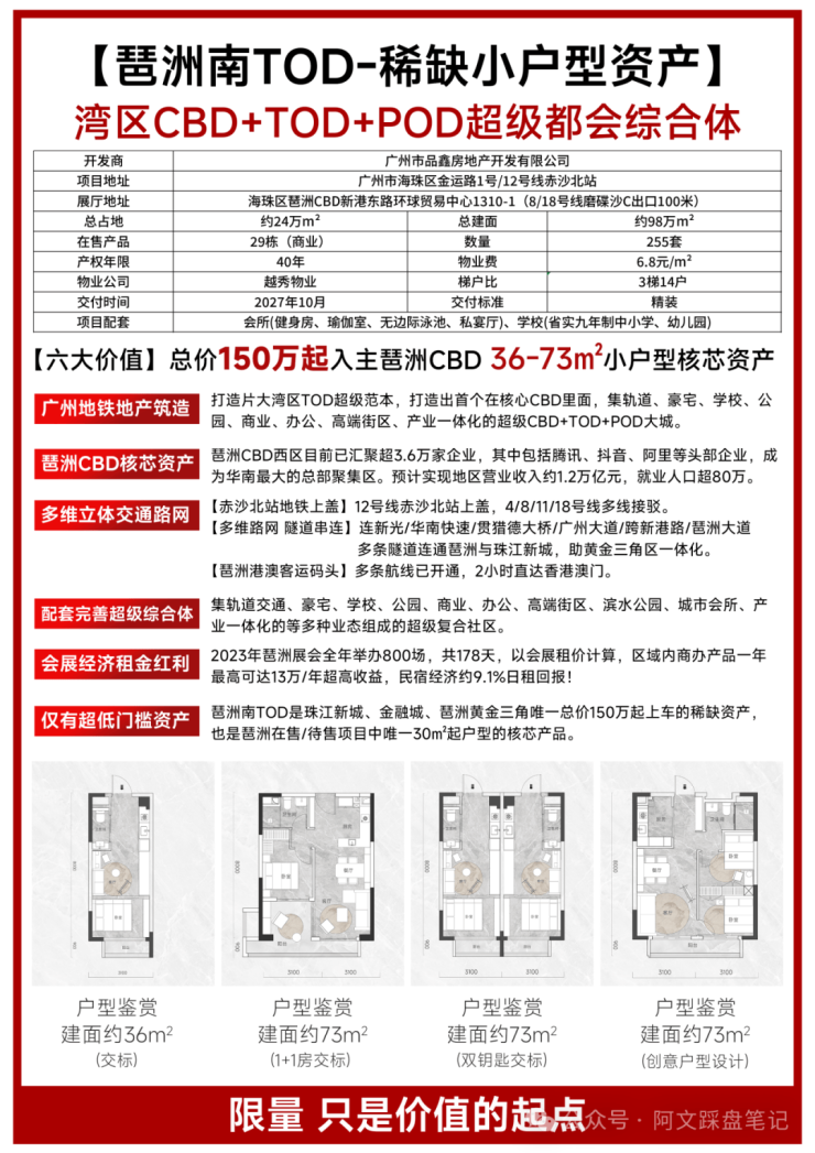 项目是琶洲稀缺小面积产品,同时,琶洲南TOD是珠江新城、金融城、琶洲黄金三角唯一总价150万起上车的稀缺资产,也是琶洲在售/待售项目中唯一30平起户型的核芯产品。