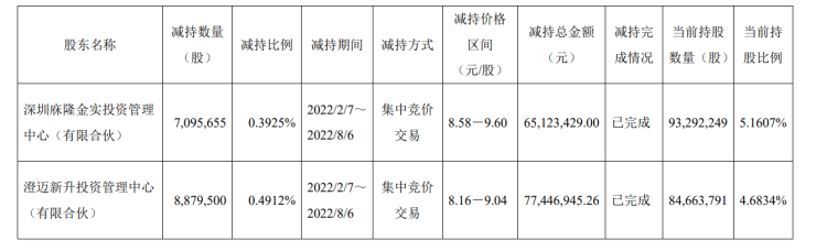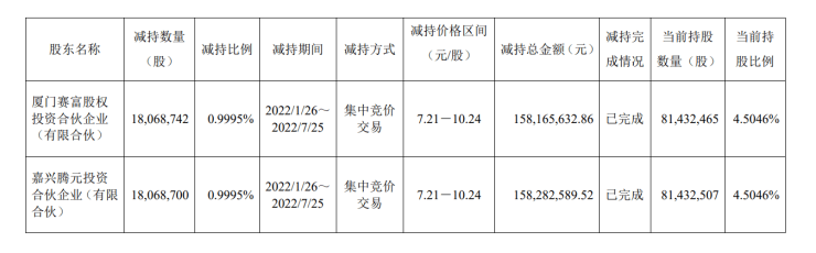 至减持期满,厦门赛富和嘉兴腾元合计累计减持公司股份36,137,442 股,占公司总股本的1.999%;庥隆金实和澄迈新升累计减持公司股份 15,975,155 股,占公司总股本的 0.8837%。套现约4.59亿元。