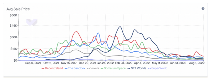 WeMeta平台数据显示,2022年虚拟土地的价格大幅下降。从六个主要以太坊元宇宙平台来看,平均价格从1月的约1.7万美元下降到8月的约2500美元,跌去近85%。