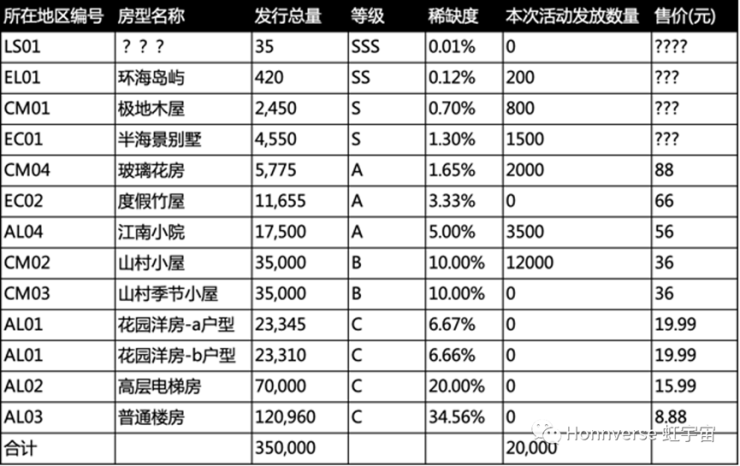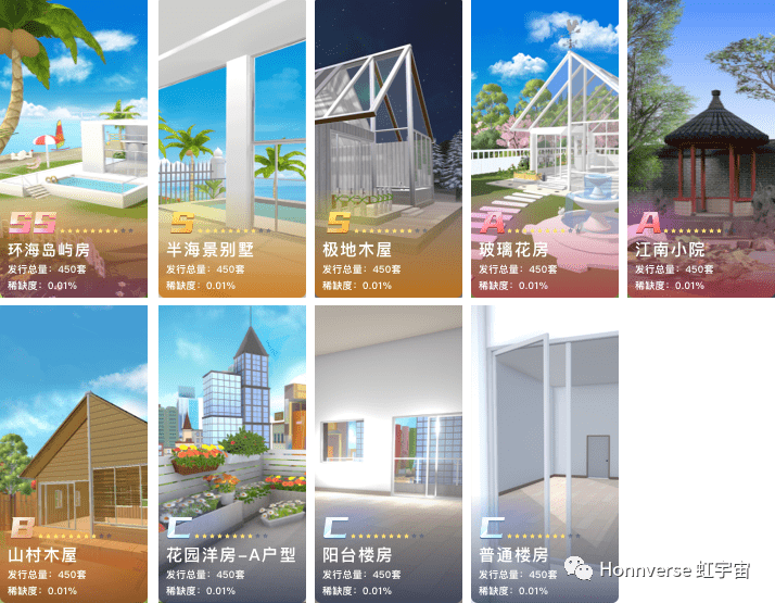 虹宇宙有13种房型,总发行量为35万套,根据级别分为SSS、SS、S、A、B、C六级,级别越高,数量越少,也越“值钱”。B级以上的房屋都配套有绑定的地契。