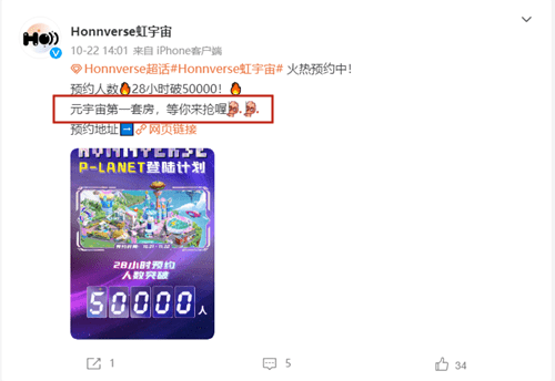 在国内,去年10月,一款自称元宇宙App的“Honnverse虹宇宙”打出了一个抓人眼球的广告标语:“抢元宇宙排名前列套房”。