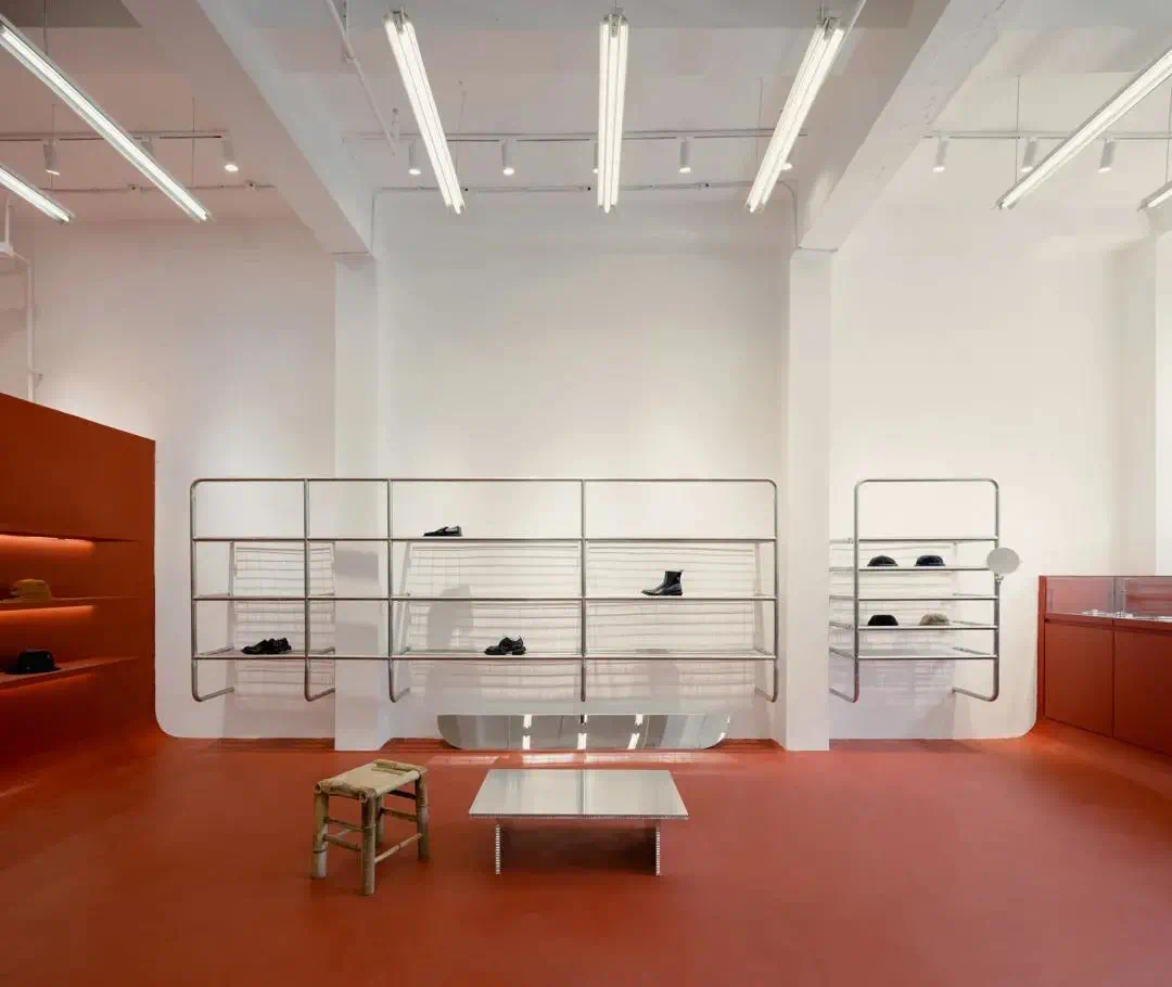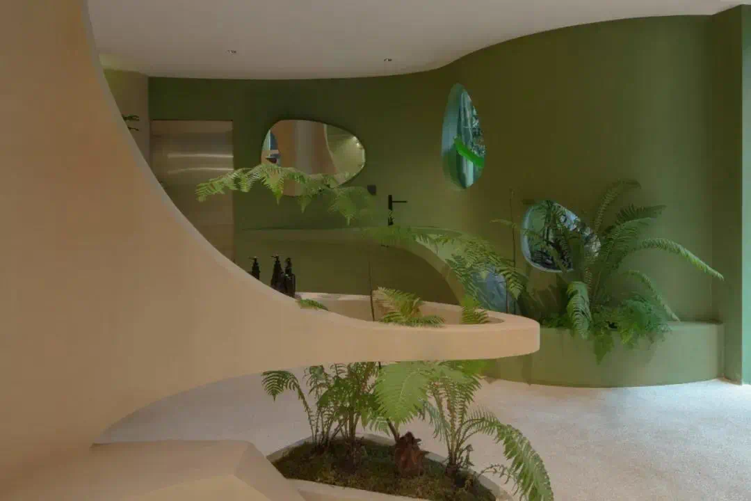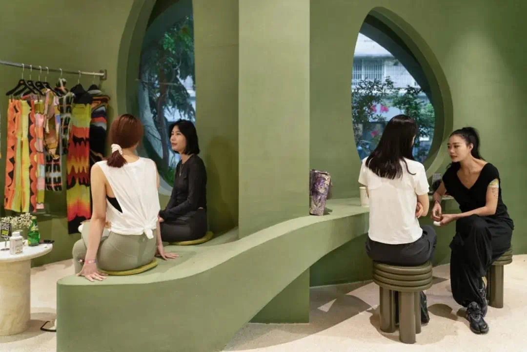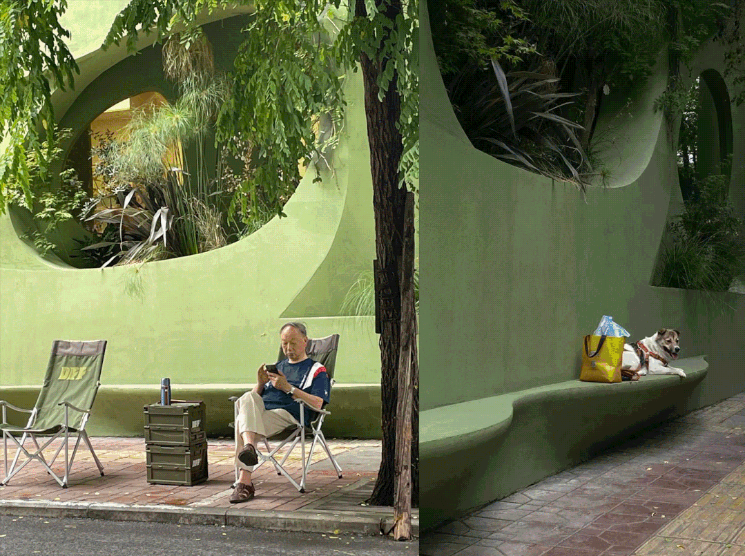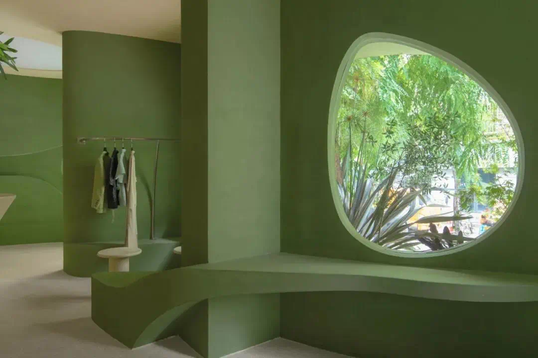 三楼为男装空间,以及主打黑胶唱片的SOUND in the PARK。儿童游乐场的红色转盘变成了一个展示架,黄蓝色的单杠双杠化身为银灰色的晾衣架。项目模糊了室内室外的界限,呈现了生活、在地性及街区文化的融合。02 传播邻里时尚项目位于成都市锦江区红星路二段干槐树街10号附1号,Dressing For Fun,中文名“耍衫”,谐音成都话“耍噻”,从名字就透露着市井气,冲淡了它原本作为一家时尚买手店的距离感,也增添了些许解构权威的叛逆感和幽默感。满墙的绿植消解了流线型建筑的现代感与周围民居的烟火气之间的冲突。孩子们可以坐在墙边的弧形座椅玩耍。集装箱和户外露营椅向来往的路人伸出了友好的臂膀,吸引邻里在此驻足休憩。