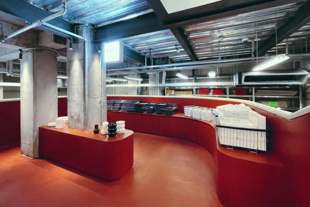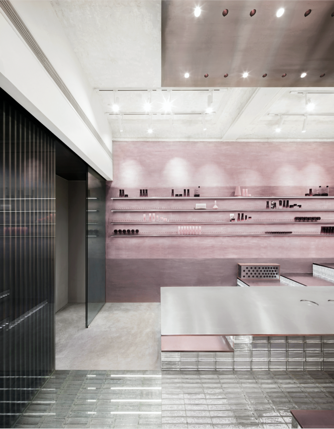 在空间基调上,萃取普洱的红艳汤色,将之调和为饱和度较低的暗粉,既诠释了美妆产品与茶文化的融合,也为现代生活压力带来一种亲和的抚慰。