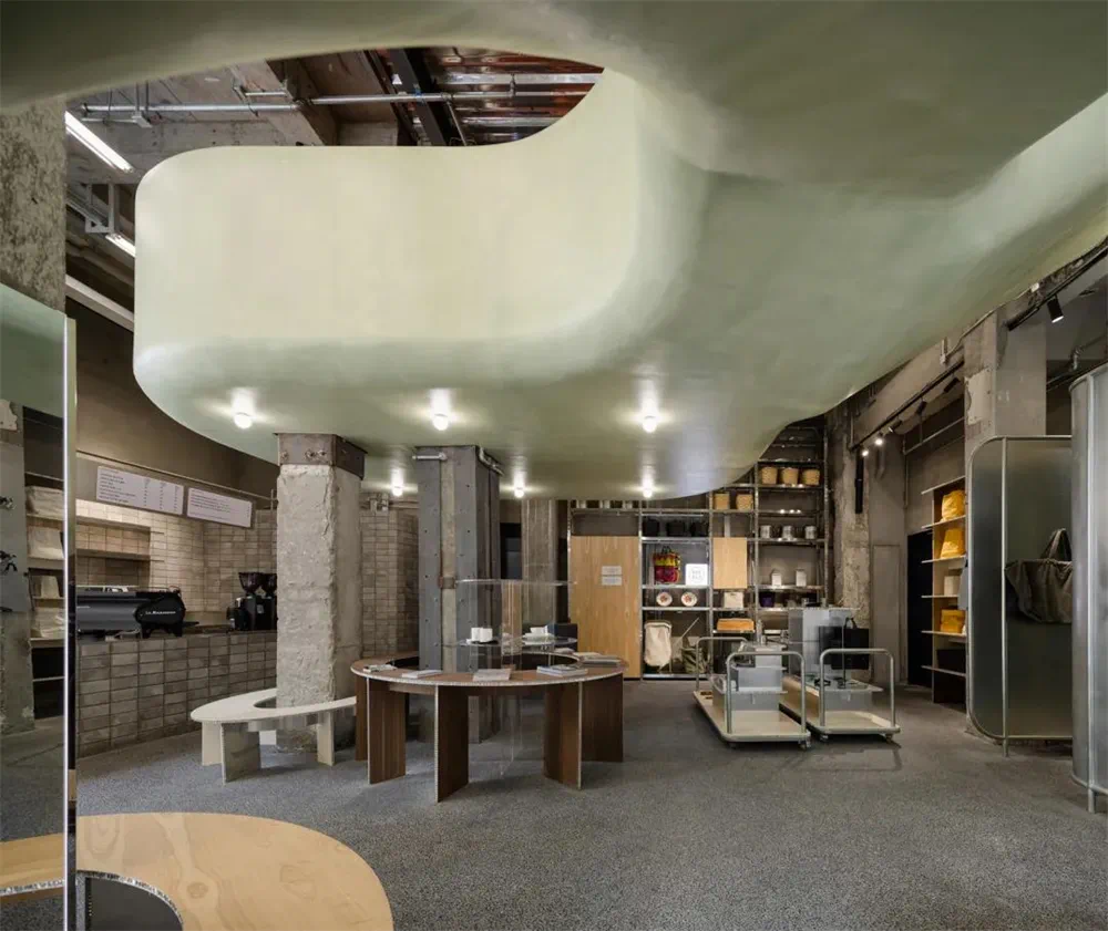 室内空间,所有的陈列台、墙面、桌椅甚至镜面都是圆弧形的,整个空间圆融到没有一丝棱角。