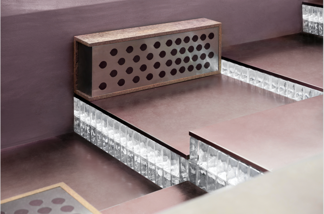 玻璃砖与金属结合而成的固定台阶,以轻盈与厚重之间的平衡美感,引导客人拾级而上,自由落座。