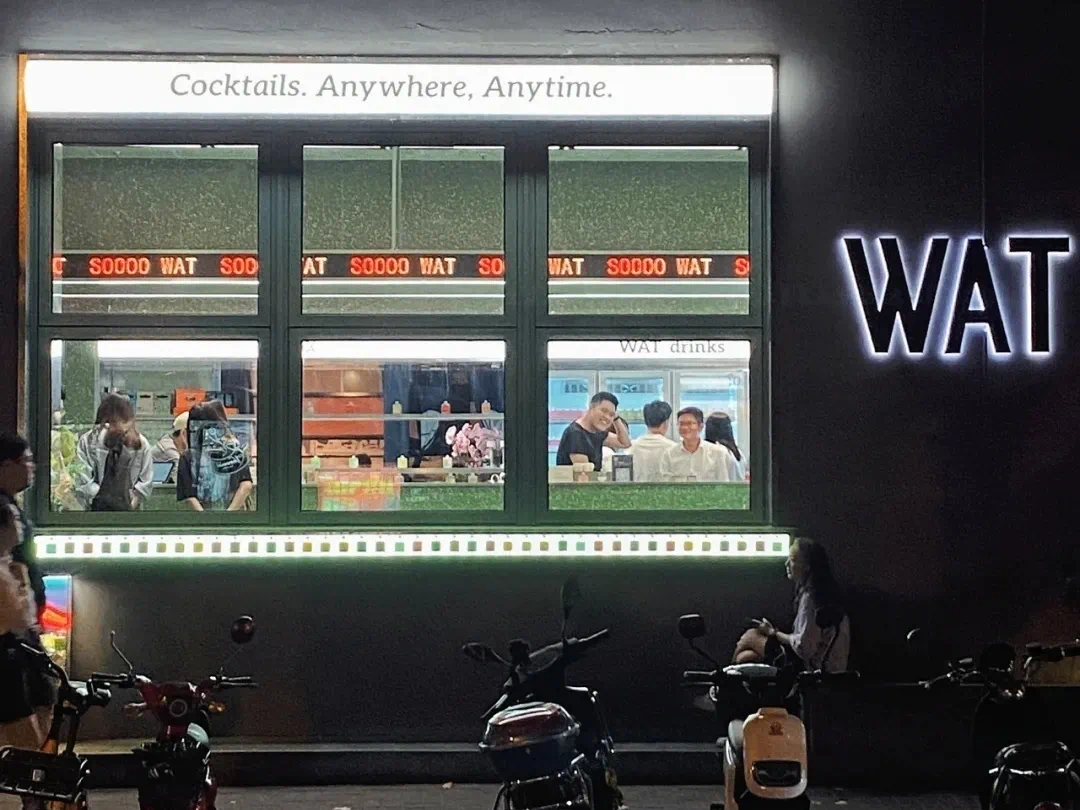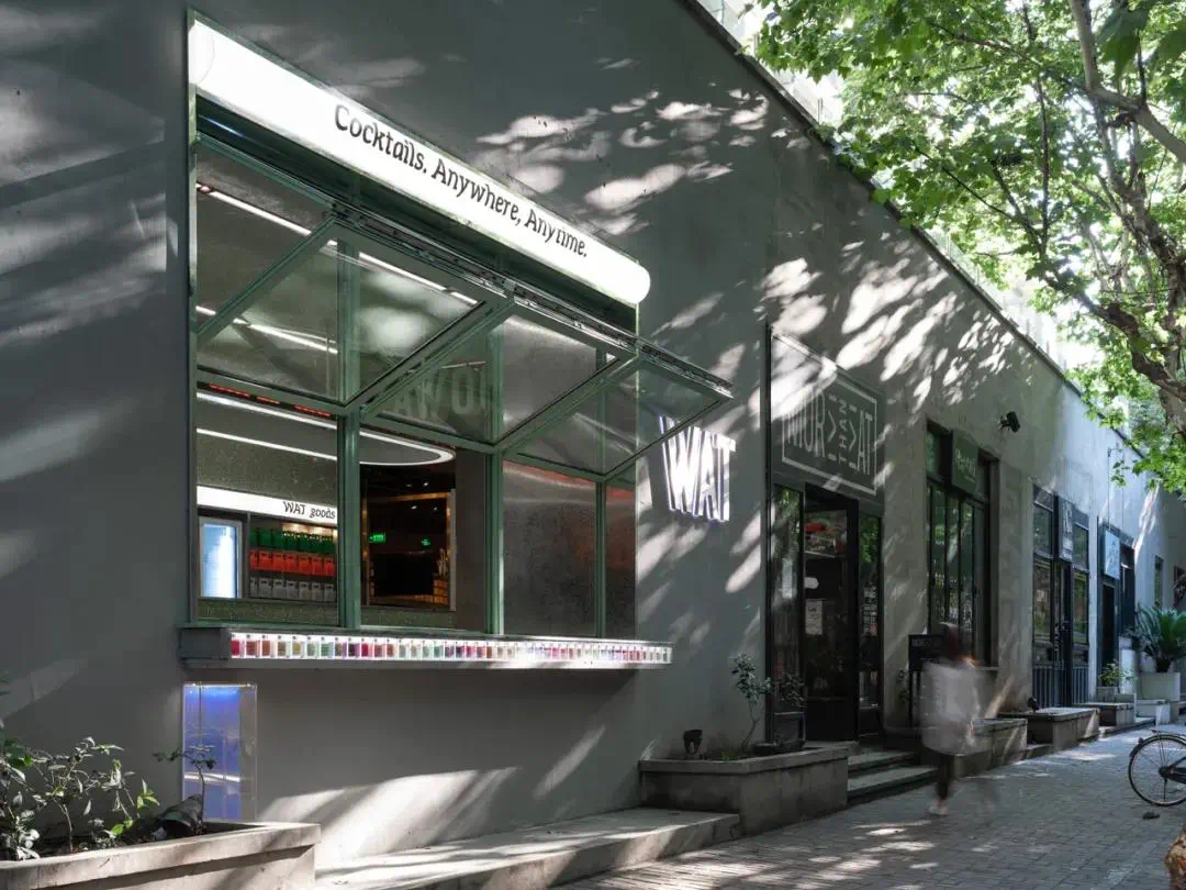 茶妆品牌Cosmetea打造的线下体验店,从空间设计和品牌策划的维度,构筑艺术化和沉浸式的场景体验,探索自然与人造之间,既有环境与未来建筑之间的关系哲学,也将品牌引向创意与可续的进化之道。04 对话城市街道WAT 源自英文中惊呼“WHAT!”的谐音,象征打破调酒规律的新尝试。团队希望通过老建筑和新空间的叙事性再造,以具有时代精神的设计,优雅的介入城市的时空肌理。