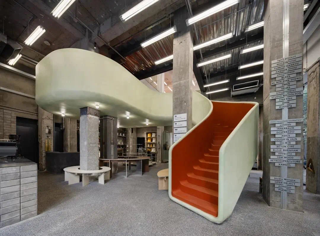 一楼包括Magazine/Book 出版、Zakka 杂货、COFFEE in the PARK 咖啡。围绕水泥柱的环形置物架,让人想到公园里环绕大树的座椅,红色橡胶色的楼梯像健身公园的跑道。试衣间也做成了公共卫生间的造型。