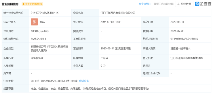 据了解,江门江海万达商业投资有限公司成立于2020年8月11日,注册资本1000万元,法定代表人张晶。经营范围包括商业、物业投资,商业、物业管理,房屋出租。此前由万达地产持股100%。
