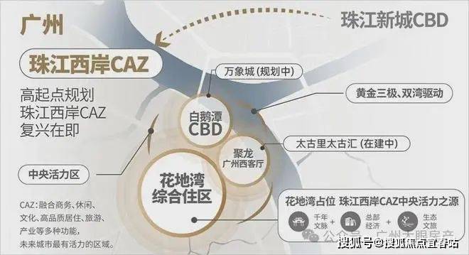 此外花地湾片区基本都是由万科统一开发,汇合白鹅潭-花地湾-聚龙组团的板块张力,白鹅潭核心区、聚龙组团、花地湾组团,于半径约2KM内构建珠江西岸CAZ黄金三极。
